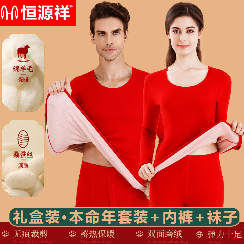 羊毛双面磨绒秋衣秋裤套装男女本命年大红色保暖内衣礼盒装
