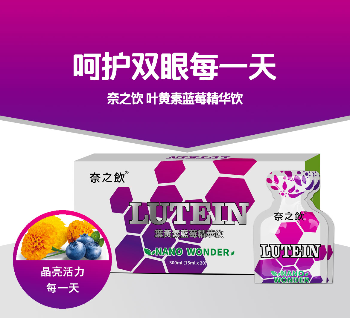 奈之饮纳米蓝莓叶黄素脂,纳米科技专利成份及配方,萃取草本精华,吸收效率高,纳米级颗粒小,见效快。适宜人群:视力不佳者、长期使用电脑手机族群、学生族群,保护视力最佳营养品。