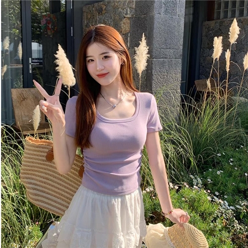 紫色短袖T恤女夏季2025年新款方领修身收腰短款正肩上衣