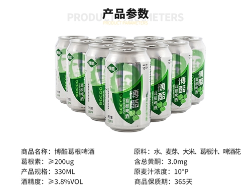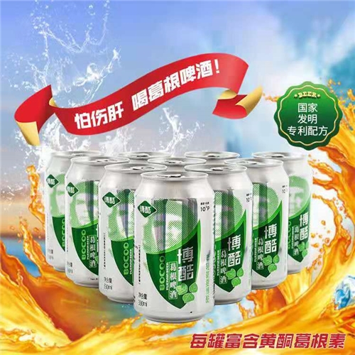 博酷葛根啤酒中的葛根素可以分解乙醇(啤酒的成分),减少乙醇对大脑的伤害,减轻酒精对肠胃的刺激,促进新陈代谢,促使血液排掉酒精毒素。全国包邮,除新疆西藏偏远地区不发货