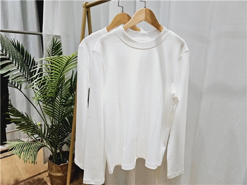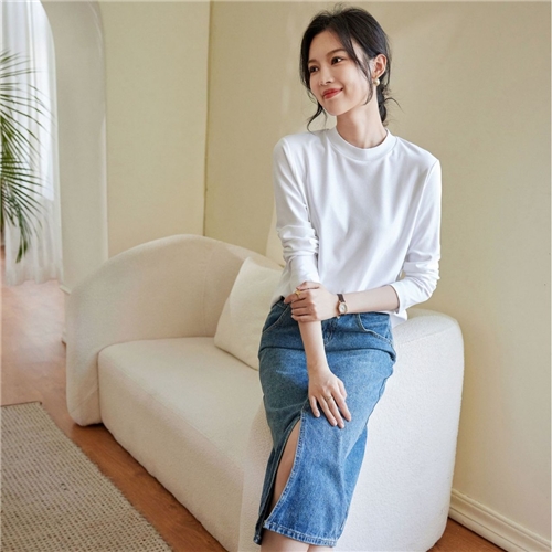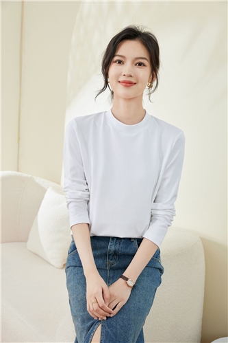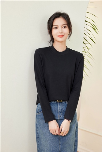 秋新款后中缝纯色棉T极简风女士T恤别致款领套头圆领长袖T恤