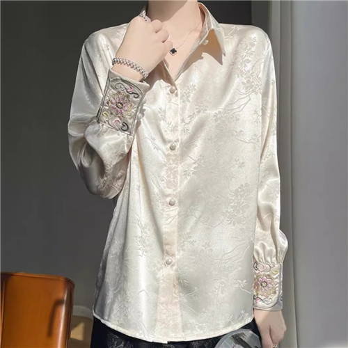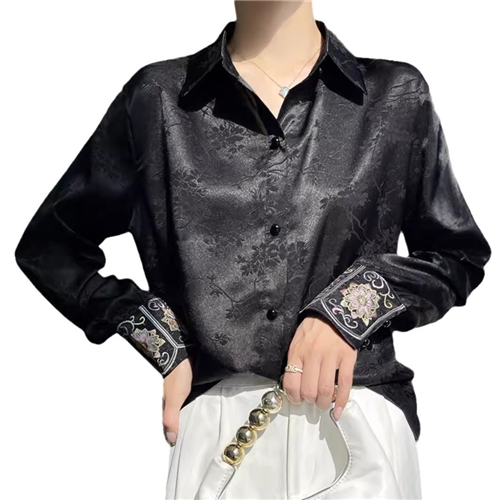 新中式醋酸缎面提花衬衫女2024新款复古国风唐装上衣设计长袖衬衣